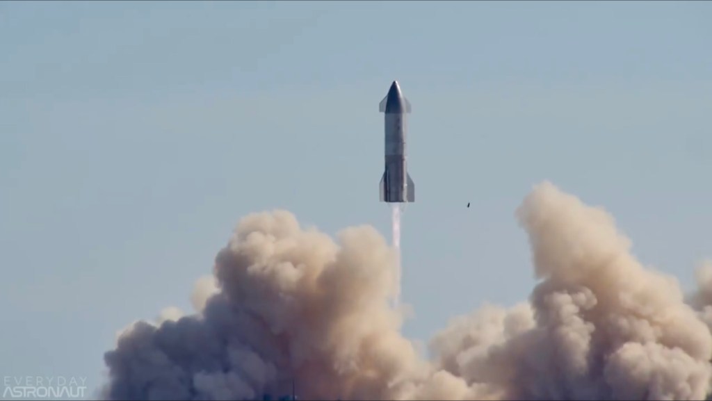 The vehicle continued upward until it reached its 10 kilometer apogee, where it hovered for a period of time. There, it performed a propellant transition to the header tanks before reorienting itself into a horizontal position and shutting off its third Raptor engine at around 4 minutes and 30 seconds into flight.